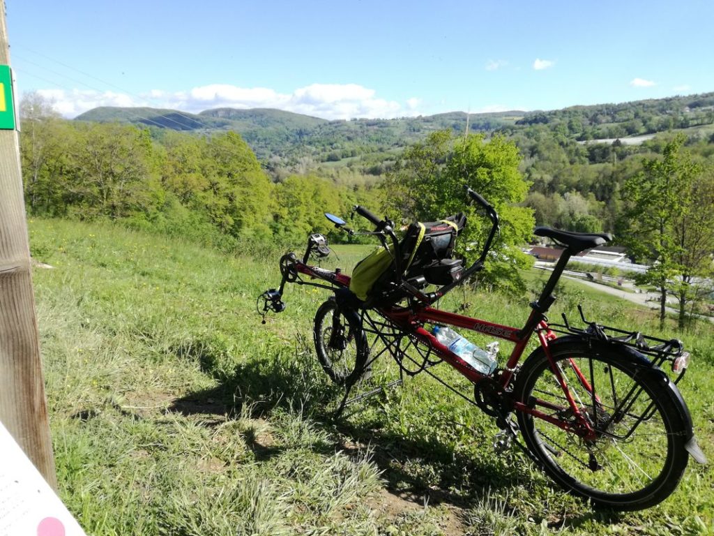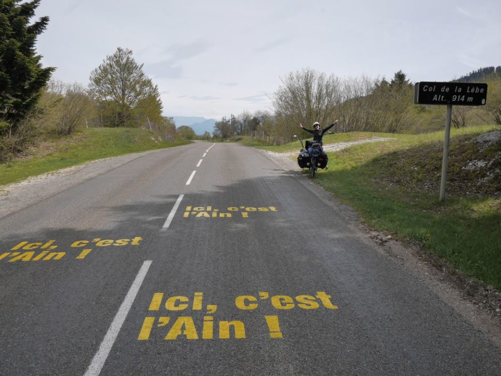 Malgré l’assourdissant concert de crapauds du soir (ah la Dombes….) nous nous reposons bien (trop ?) en tous cas nous sommes frais et dispo pour attaquer le col de la Lèbe ce mardi 7 mai dès 9h40 (parce qu’on est lent sur le vélo mais aussi avant le vélo). C’est un test, un petit col (800m de D+ quand même) qui nous permettra de voir ce que vaut Chico en montée, et d’adapter l’itinéraire quand nous serons dans les Alpes.