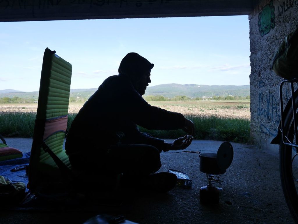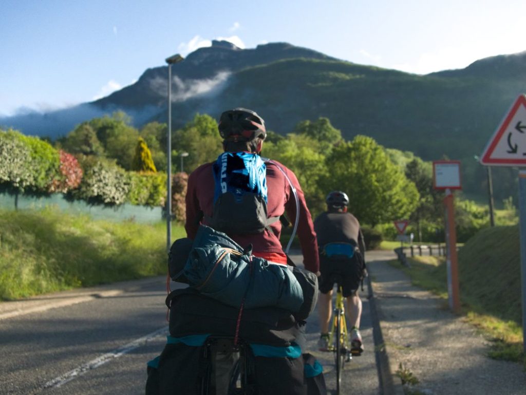 Nous pouvons nous reposer chez Laurence qui nous fait le plaisir de nous accompagner le lendemain sur une vingtaine de km en nous faisant découvrir de magnifiques chemins en direction de Belleville. Notre objectif du jour est Ambronay, à 70km, non loin du départ du col de la Lèbe (ça c’est pour le lendemain). La nuit est fraîche, nous trouvons refuge dans un abri en béton en face d’un champs afin d’éviter le vent.