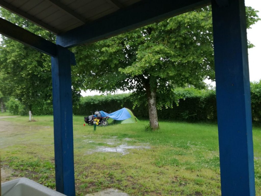 Le lendemain la météo nous annonce une grosse pluie dans l’après-midi. Notre plan est donc d’aller au camping en espérant avoir une salle hors-sac pour passer la soirée. Notre Chico nous emmène donc dans le camping de Montmédy. Ce charmant camping se trouve en haut d’un côte très très pentue mais heureusement pas trop longue ! Et juste à coté d’une Citadelle. La météo n’a pas menti : la pluie est dense ! Qu’importe car nous avons eu le temps d’installer notre tente et même notre bâche entre la tente et le vélo. Ce toit de fortune était censé nous permettre de dîner au « sec » en cas de bivouac pluvieux. L’expérience a montré qu’en cas de très forte pluie + vent, cette installation n’est pas efficace ! Pour le dîner, le préau du camping s’avère beaucoup plus sec… repas au pied des lavabos mais en écoutant Nina Simone pour mettre du baume au cœur. Dans l’après-midi, une accalmie nous permet de visiter la Citadelle. Nous sommes étonnés de voir que l’intérieur de la Citadelle entoure des maisons du village.