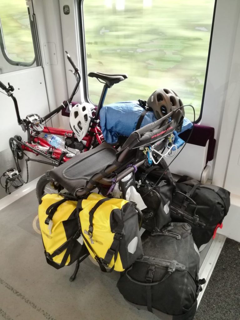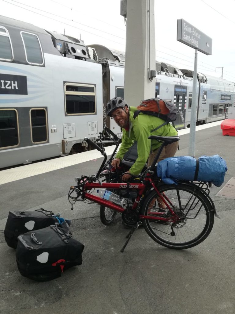 Sauf la journée de « break » au Mont-Saint-Michel, voilà plus de 10 jours que nous roulons tous les jours avec des journée à 70/80 km, c’est assez dur physiquement. Kevin commence à avoir mal à un mollet et moi aux genoux. Nous avons hâte d’arriver à Douarnenez pour faire une vraie pause de quelques jours. Une autre mission s’impose à nous avant le repos tant attendu : prendre le train ! Ce qui n’est pas une mince affaire avec un tandem bien chargé. Arrivés à la gare un panneau met en garde : « si vous voyager avec votre vélo, la sncf se réserve le droit du vous interdire l’accès au train pendant les périodes de forte affluence » et plus loin : « tandems interdits »… Alors un 15 août, ça passe ou ça casse… Et bien ça l’a fait ! Et nous avons pourtant pris 3 trains différents pour arriver à bon port. Nous avions mis les chances de notre coté en démontant Chico en 2. Arrivés à la gare de Quimper, on retrouve notre ami Philippe et son père qui sont venu nous chercher en voiture et ainsi nous évitent 20 kilomètres avec pas mal de dénivelé pour relier Douarnenez. Parfois la voiture c’est bien.