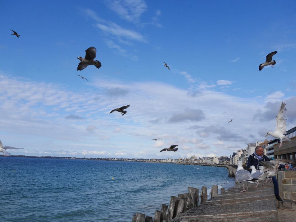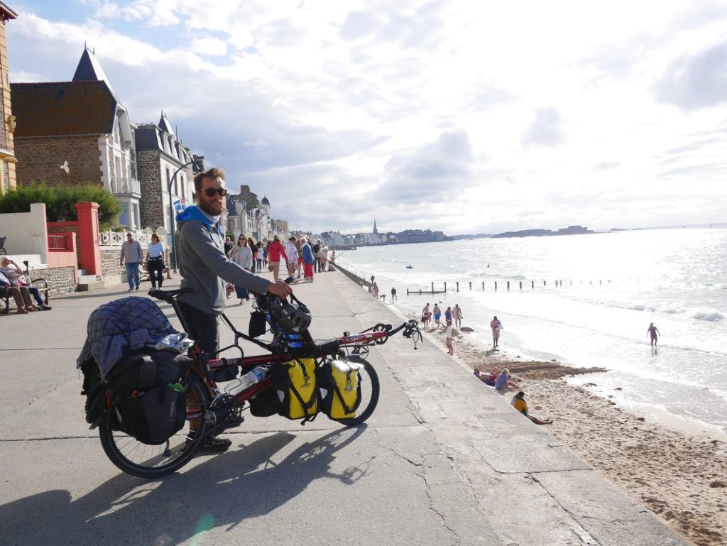Arrivés à proximité de St Malo, c’est baignade ! On hallucine de la quantité de gens sur la plage, ça change du calme du Cotentin que nous avons quitté quelques jours plus tôt. Sur une même plage on observe tout ce que la mer offre comme divertissements : char à voile, surf, paddle, planche à voile, voilier, catamaran et j’en passe… Lorsqu’on découvre le centre ville, on décide d’y passer toute la soirée et de rejoindre un camping en fin de soirée seulement. Après quelques coups de fil pour réserver un emplacement tente, nous découvrons que tous les camping à proximité immédiate de la ville sont complets (le festival de la route du rock commence quelques jours après…). Il faudra donc faire une bonne dizaine de kilomètres de vélo dans la nuit pour le premier camping qui a une place pour nous. Le gars est très arrangeant on peut donc faire notre petite soirée resto en ville en toute tranquillité. On déguste nos premières galettes bretonnes dans l’effervescence du centre ville.