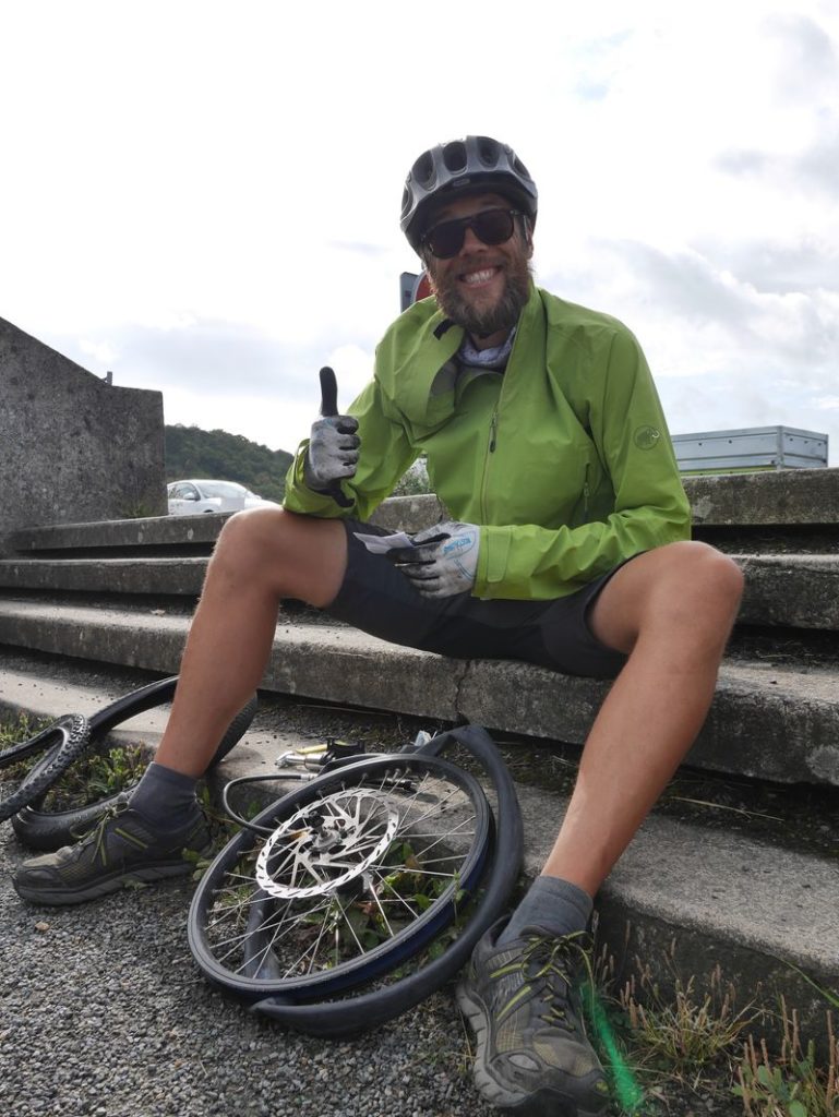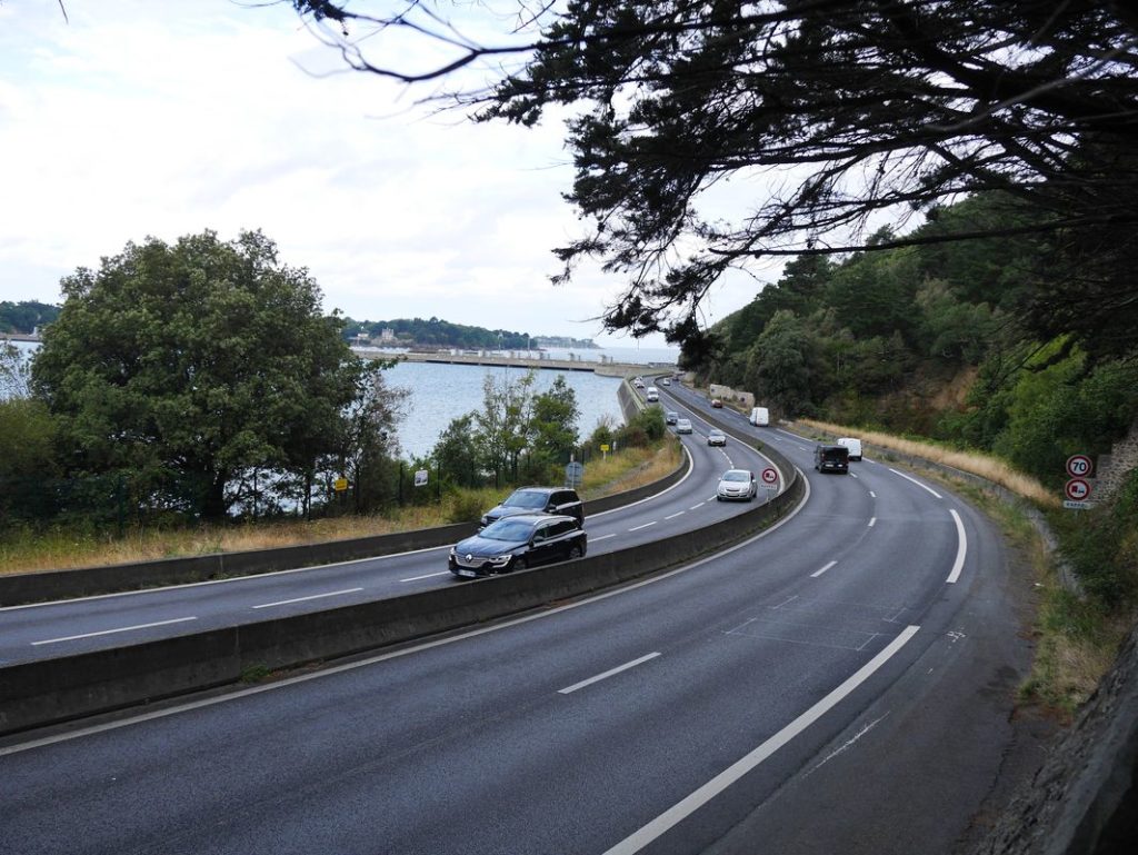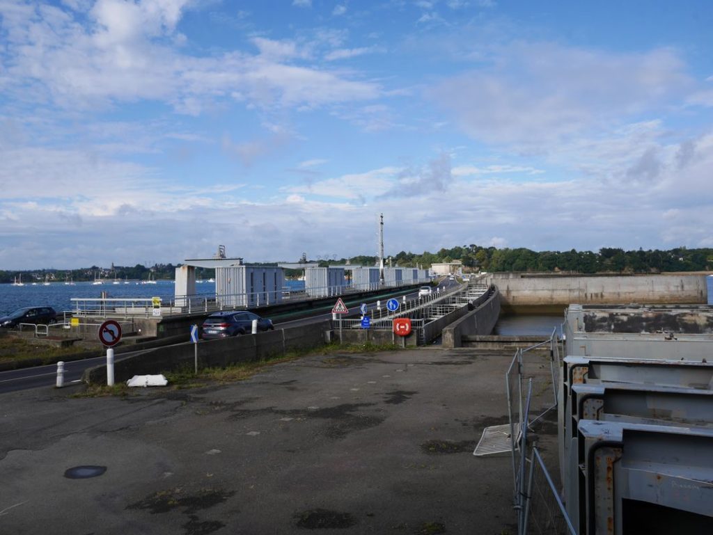 Le lendemain matin, on se décide de retenter l’option « traverse comme un piéton ». De jour est au sec, le parcours est praticable. Une fois sur le fameux pont, notre pneu avant décide d’exploser, la blague ! On prend le truc sereinement, nous avons un pneu de rechange dans nos affaires, forts de l’expérience similaire dans le Cotentin. A la dernière explosion (cf article précédent), nous avions acheté deux pneus de remplacement de qualité standard, faute de mieux dans le magasin. Il aura fallut 4 jours de vélo pour que le pneu explose (contre 3 mois pour le pneu costaud : un Marathon Plus bien sûr !). Bref, nous arrivons de l’autre coté du pont avec un pneu changé mais qui a l’air encore moins résistant que le précédent. On se creuse la tête une nouvelle fois pour trouver comment éviter de rouler sur la départementale de l’enfer et rejoindre un magasin de vélo de Dinard (merci l’application Iphigénie qui nous a bien aidés !). Là nous trouvons le pneu adéquat…une matinée complète est passée !