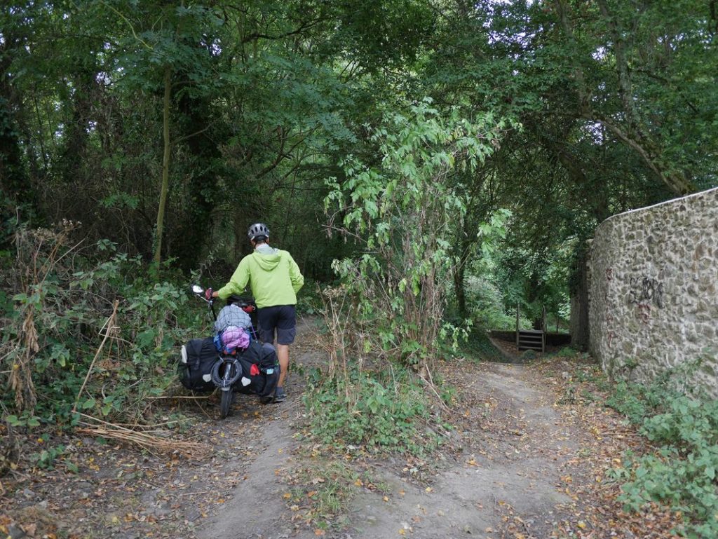 La nuit tombée, armés de notre dynamo, on se lance pour rejoindre le fameux camping. Nous savions qu’un pont se trouvait sur notre route, mais ce que nous savions pas c’est que c’est LE pont scandaleux du coin car pas du tout équipé pour les vélos (alors qu’il se trouve à proximité d’une véloroute et que le détour pour passer de l’autre coté ajoute 30 kilomètres). Concrètement lorsque nous sommes arrivés à proximité du pont, nous avons dû prendre une sorte de bretelle d’accès plus du tout éclairé avec, au bout de la bretelle, une 2X2 voie avec muret béton central sans bande d’arrêt d’urgence et avec des voitures circulants plus autour des 80 km/h que des 70 autorisés. L’enfer ! Déjà pas tellement rassurée de circuler de nuit sur une longue distance, me voilà en panique à dire à Kévin : « On sort direct de cette autoroute de l’enfer ! ». Google maps que j’avais sous les yeux indiquait une sortie quelques mètres après notre arrivée sur la double voie. Un peu remis de notre émotion et après quelques recherches internet, on repère un chemin piéton qui semble permettre d’accès à l’entrée du pont sur une passerelle sécurisée. On tente de l’emprunter : un chemin de terre qui descend en pente raide dans la forêt… avec la pluie qui se met à tomber à ce moment là ! On se rend vite compte que dans la nuit noire, sous la pluie et les nerfs qui commencent à lâcher… la tentative est foireuse. Aussi je suggère une autre option : dormons dans le jardin public qui se trouve à 2 pas de là et adieu camping accueillant ! Alors hop, nous voilà à monter la tente dans un coin d’une grande pelouse franchement calme (seuls quelques camping car dorment sur un parking à proximité). Il est minuit, et ultime mission : il nous faut de l’eau, plus une goutte dans nos gourdes ! On enfourche une nouvelle fois Chico en s’armant de courage (les nerfs en pelote ça fatigue vachement !) pour rouler encore quelques mètres jusqu’au cimetière le plus proche (notre source numéro 1 d’eau potable ). Portail fermé, une grande enjambée au dessus du mur et zou !