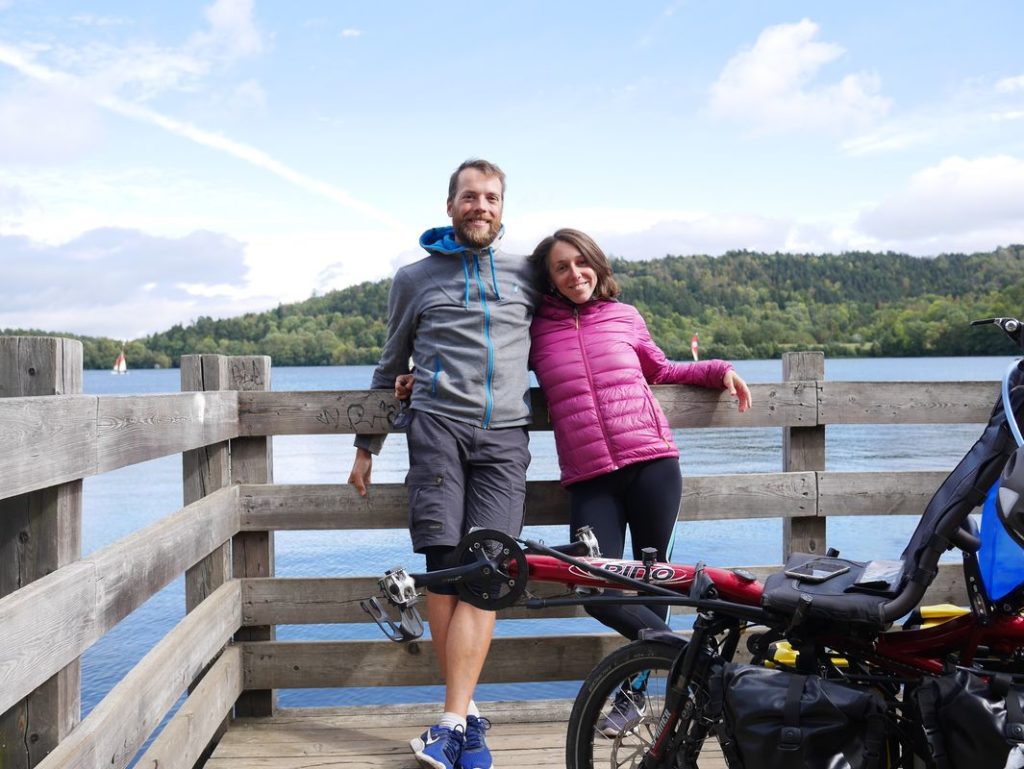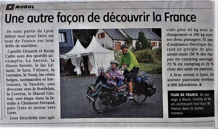 Le 3 octobre nous dormons à Besse, 1100m d’altitude. La météo nous apprend qu’il fera 2°C cette nuit et qu’il pleuvra toute la matinée…on craque, on va à l’hôtel, ce sera l’occasion de prendre une douche après 4 nuits dehors. Après une belle grasse matinée, on ouvre les rideaux et clairement c’est la flemme. Mine de rien il nous reste 50km avant Clermont. Nous partons malgré tout. Bien nous en a pris, le nuage était accroché à Besse et 10km plus loin il fait clair. Notre route passe par le lac Chambon et Murol avant de remonter sur Aydat. Pendant la montée nous nous faisons interpeller par un homme avec un appareil photo. On s’arrête. Le type nous apprend qu’il est journaliste pour la Montagne, le journal local et nous propose une interview ! C’est la grosse classe il faut le dire. De La Montagne à l’Équipe il n’a qu’un pas.