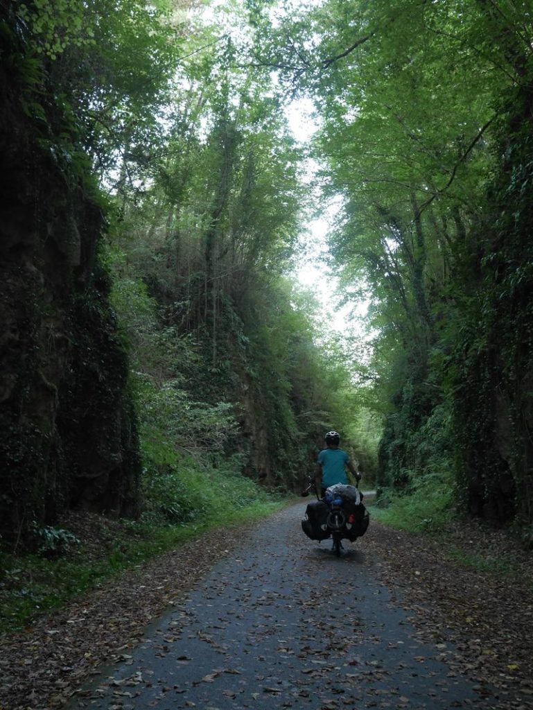 Après tant de semaines passées à longer la côte, notre itinéraire va désormais tracer dans les terres, l’objectif est de traverser le massif central pour rejoindre Clermont-Ferrand. Nous partons en direction de Villeneuve-sur-Lot en prenant la voie verte Lapébie pendant deux jours. Le paysage commence à être vallonné, et ce n’est pas pour nous déplaire, la platitude de la côte ouest commençait à nous lasser. Dans le Lot-et-Garonne il y a des chevreuils à tous les coins de rue, nous en voyons littéralement tous les jours, par groupe de trois qui traversent la piste cyclable à toute blinde ! Deux jours de voie verte à 90km par jour pour atteindre Penne d’Agenais chez nos amis Claire et Réno.