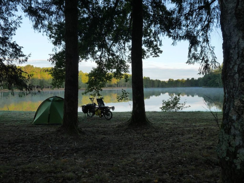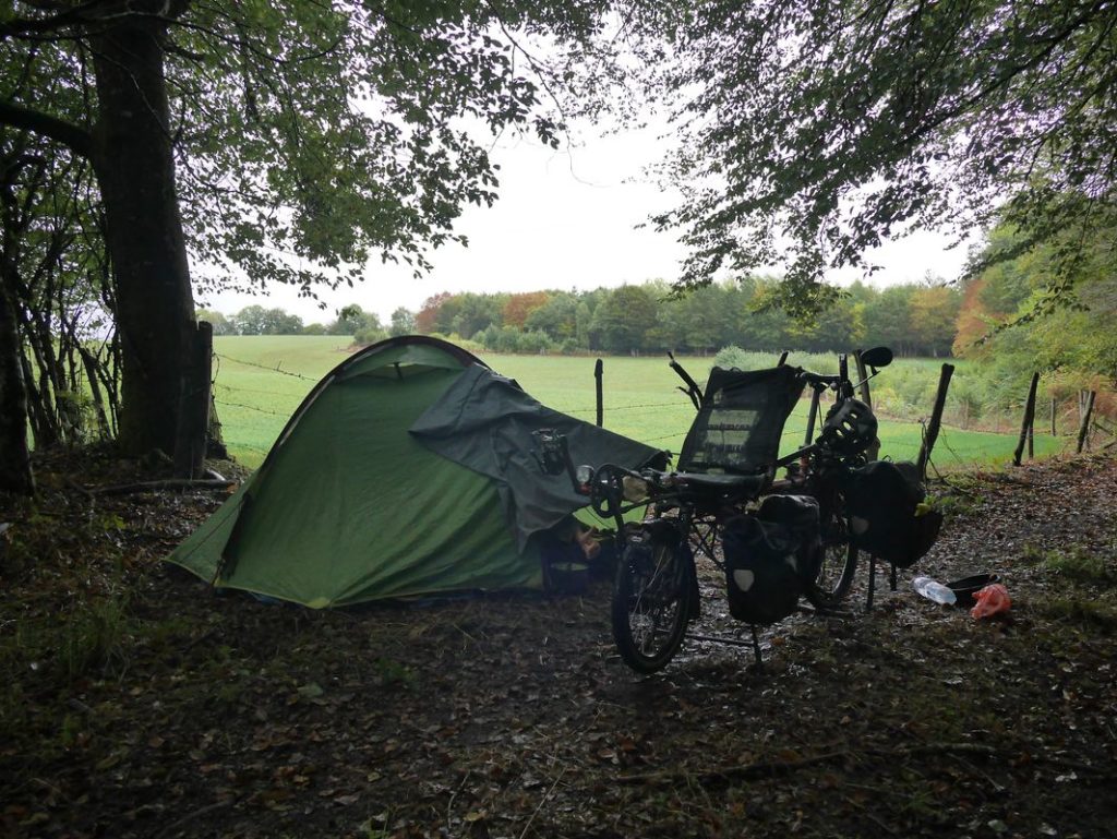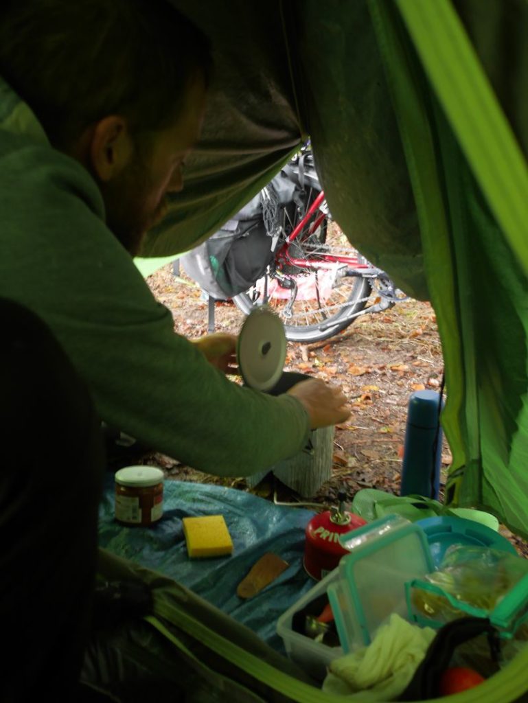 D’ailleurs nous enchaînons quelques bivouacs et lorsque nous souhaitons nous arrêter dans les campings ceux ci sont tous fermés, ou presque. Le premier est soit-disant ouvert, mais en appelant la gardienne au téléphone elle refuse de se déplacer et tous les sanitaires sont fermés. Exaspérés nous reprenons la route et finalement installons notre bivouac sur un chemin tracteur, boueux et sombre. Il pleut toute la soirée et toute la nuit, ce qui nous permet de faire nos premiers repas et petit déj directement dans la tente.