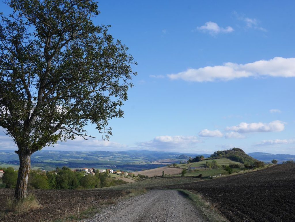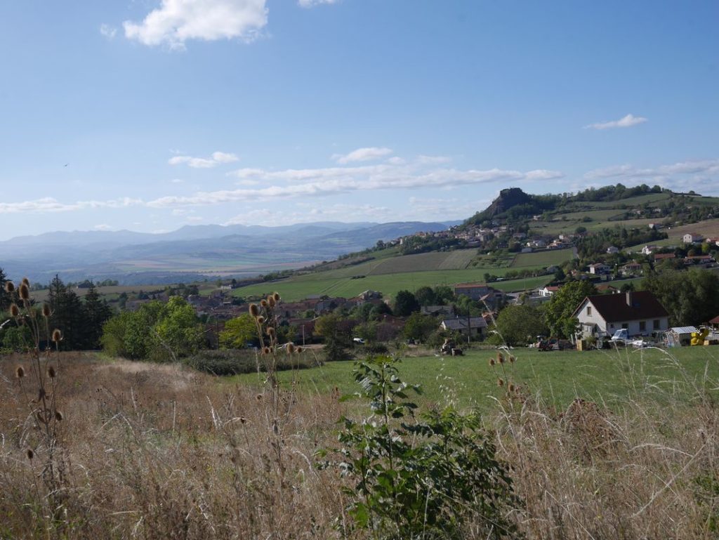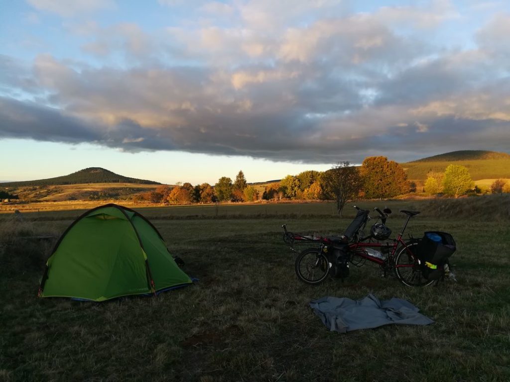Pour limiter le dénivelé qui promet d’être costaux (5000 mètres pour les 6 jours), nous contournons le massif du parc du Livradois-Forez en passant plutôt par la plaine, plein sud. La sortie de Clermont-Ferrand n’est pas géniale, on voit assez clairement que la ville se préoccupe davantage des ses voitures que de ses vélos (pourtant nombreux dans le coin, mais plutôt en version route que déplacements citadins). La campagne nous tend rapidement les bras et on est vite charmés par ces petits puys bien verts. Notre premier bivouac ce jour là est magnifique.