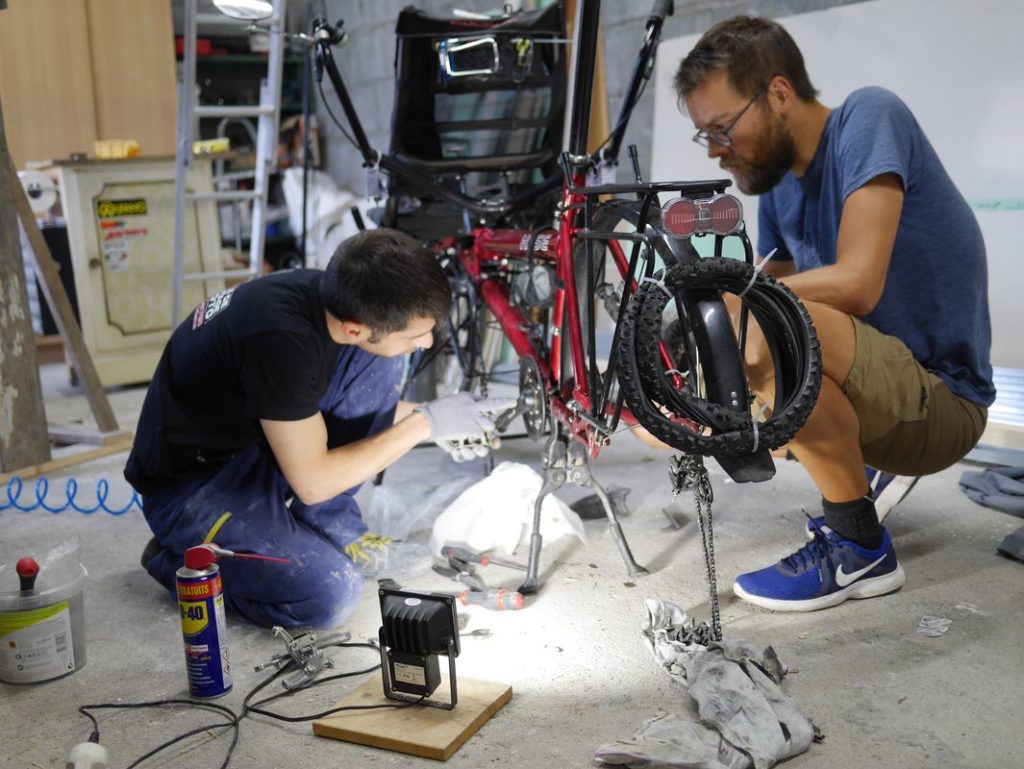 Pendant le week-end Clermontois, Chico a été légèrement modifié : la roue libre avant n’est plus ! Nous avons dû la condamner car elle ne fonctionnait plus correctement : les 2 derniers jours avant d’arriver, à plusieurs reprises le pédalier avant n’entraînait plus le pédalier arrière, Kévin se retrouvait donc seul à pouvoir pédaler et nous devions nous arrêter quasi instantanément. En bidouillant le mécanisme nous parvenions à le faire fonctionner mais tout cela était bien précaire et nous n’envisagions pas de faire les 700 kilomètres restant comme cela. C’est là où mon frère, bricoleur de génie (pas moins!), est intervenu pour souder le tout et ainsi nous permettre de repartir sereinement. L’absence de roue libre à l’avant n’a pas été tellement un problème ; seulement pour quelques passages de chicanes je devait lever les pieds pour pas gêner les manœuvres de Kévin.