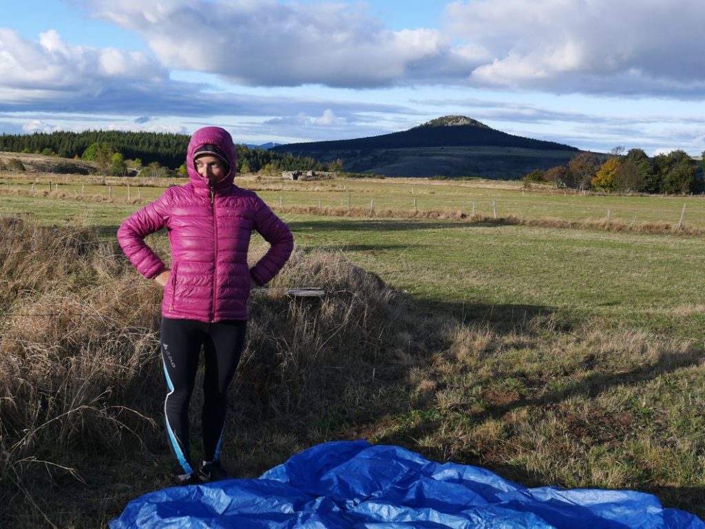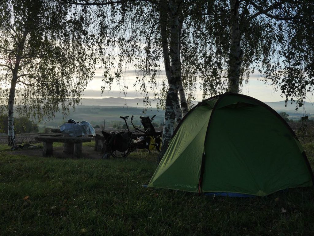 C’est à partir de là que le dénivelé va se faire plus important car nous entrons dans le Parc des Monts d’Ardèche. Notre départ du Puy-en-Velay est raide : 810 mètre de dénivelés sur les 33 petits kilomètres que nous parvenons à faire ce jour là. Il faut dire que nous sommes parti tard et que nous avons eu un problème technique en fin de matinée (un énième câble de dérailleur qui a lâché). Cela ne nous empêchera pas de faire un des bivouac les plus haut en altitude du séjour : on pitch à 1200 mètre ! Glagla…le soir nous sommes contraints de dîner dans la tente, les jambes dans notre duvet. Notre matériel étant adapté pour dormir autour de 0°C, la nuit a été bonne.