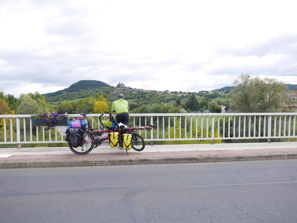 Le réveil pluvieux du lendemain est un peu dur à encaisser moralement. Premier petit déjeuner dans la tente, sous nos duvet. Heureusement pour nous, le soleil est de retour dans la journée. Kévin trouve une application pour acheter des livres audios. On écoute donc « Cessez d’être gentil, soyez vrais » de Thomas D’Ansembourg tout en pédalant. Allier développement personnel et sport, ça frôle un peu la perfection non?! Nous arrivons en début d’après-midi au Puy-en-Velay ou nous visitons courageusement les hauteurs de la ville (encore monter!) mais à pied cette fois-ci, Chico étant sagement garé dans le parking de notre gîte du soir. Cette ville est vraiment étonnante avec ses 2 grandes statues et une église juchée tout en haut d’un grand pic (ancienne cheminée volcanique).