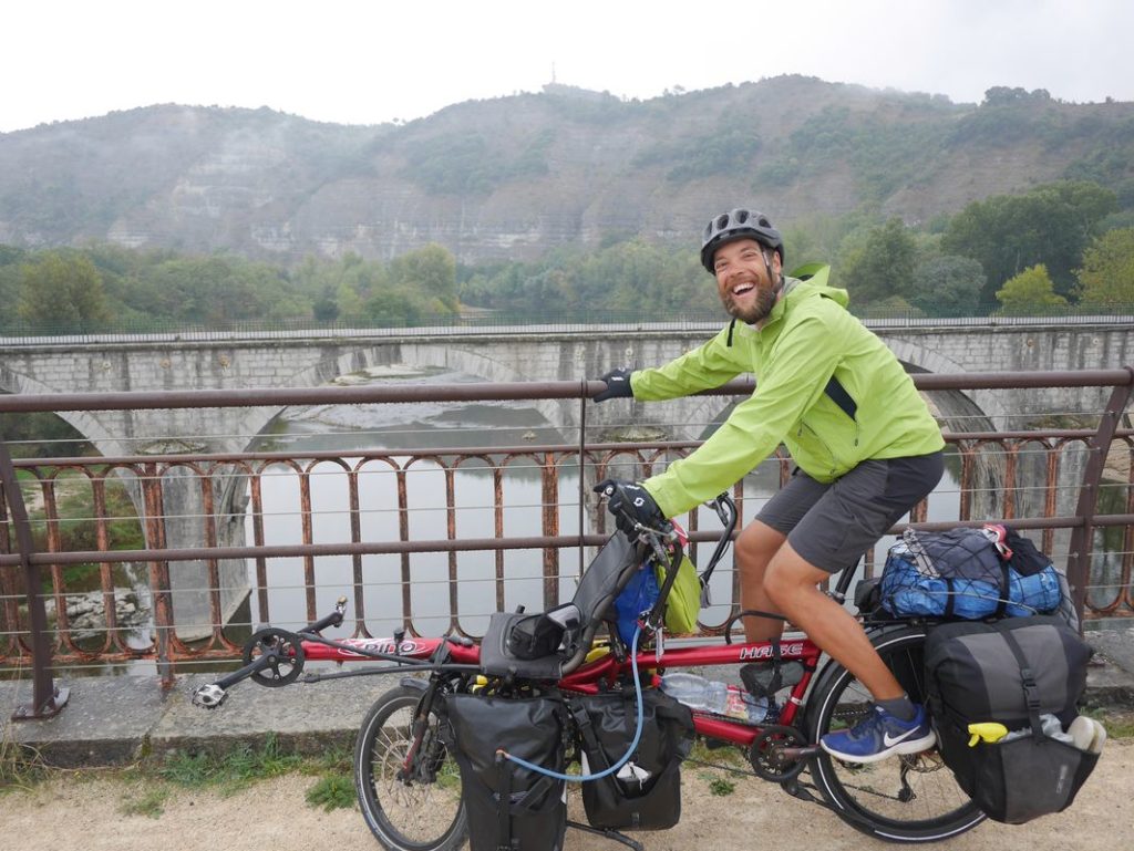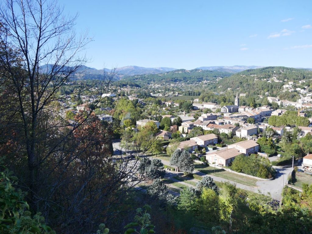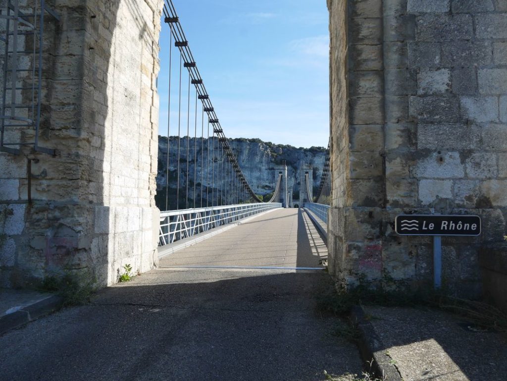 Le lendemain c’est 80km dont 40 km de descente qui nous attendent. Nous avions envisagé de visiter la Grotte Chauvet mais même malgré ce gros dénivelé négatif, la distance est trop longue pour que nous arrivions à temps pour la visite. Nous sommes tout de même gâtés ce jours là : la vue est vraiment magnifique. Notamment la route vertigineuse entre Saint-Eulalie et Montpezat qui nous amène coté « sud de la France » : les maisons changent, des odeurs de pins…ça sent le sud ! Passage à Aubenas, la ville à 2 étages…dur dur de passer à l’étage du dessus (en poussant Chico concrètement !). Ce jour-là nous faisons notre dernier camping.