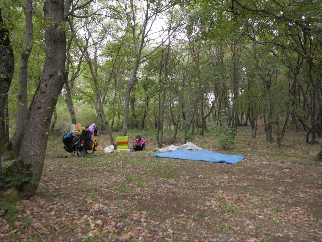 La journée suivante est plus calme d’un point de vue des nerfs et de la pente ! Ouf ! Il faut dire qu’on se fait une grasse matinée et qu’on profite du salon de notre copain Tom. Nous sommes tous les deux un peu enrhumés (signe qu’il est temps d’arrêter de parcourir les campagnes humides?!). On part seulement l’après-midi pour 47 kilomètres plutôt plats. Pas facile de trouver un coin bivouac discret aux alentours de Romans-sur-Isère, ce sera donc dans la forêt que nous feront notre dernier camping sauvage du voyage sur un terrain un peu pentu…mais réellement discret ! La pluie annoncée est fine.